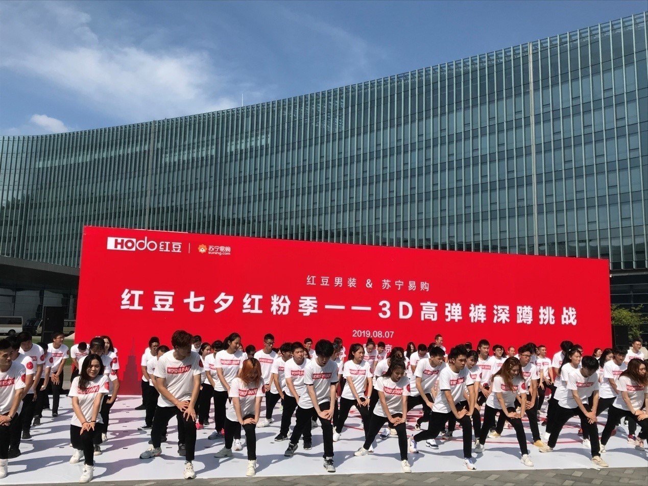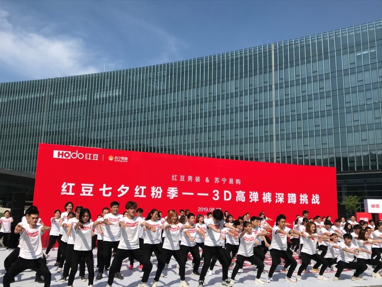 內(nèi)場的發(fā)布會全面啟動線上銷售,而外場深蹲挑戰(zhàn)是一場對高彈褲的探索,將會顛覆你對褲子的認(rèn)知,通過切身體驗產(chǎn)品的形式更直觀地展現(xiàn)了第三代紅豆3D高彈褲的高彈力、回復(fù)性與舒適度。深蹲挑戰(zhàn)還融合了七夕的主題,77對情侶在七夕這一天身穿紅豆3D高彈褲,默契搭檔挑戰(zhàn)深蹲,在音樂的變換中完成指定動作,深蹲、弓步、抬腿……他們挑戰(zhàn)自我、配合默契,突破傳統(tǒng)褲子對身體的束縛,在展現(xiàn)3D高彈褲產(chǎn)品優(yōu)點的同時,增強彼此間的互動,也為這場挑戰(zhàn)增添了甜蜜與浪漫。這場有趣的挑戰(zhàn)更像是一次情侶間默契度的考驗,也將會成為他們難忘的七夕體驗。紅豆的匠心產(chǎn)品與蘇寧平臺相結(jié)合,在七夕這個特殊的日子里,集結(jié)紅粉與77對情侶,用別具一格的深蹲挑戰(zhàn)形式演繹經(jīng)典產(chǎn)品的全新面貌。