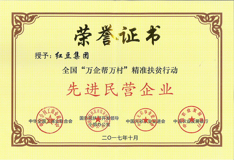 統籌共建,“輸血”扶貧。2014年6月,紅豆集團與11個地處西部山區,經濟落后的紅豆村簽訂統籌共建協議,促進紅豆村在黨建、經濟、文化工作全面發展;2017年4月,紅豆集團與經濟薄弱村徐州豐縣首羨鎮三官廟村開展“城鄉結對、文明共建”活動,助推高水平全面小康建設;2017年8月,在“中國光彩事業涼山行”活動中,紅豆集團向涼山地區捐贈200萬元,為四川老區群眾脫貧攻堅貢獻一份力量;2018年6月,紅豆集團向江蘇民營企業決勝全面小康社會精準扶貧基金捐資,為打贏脫貧攻堅戰再出力。2017年10月,紅豆集團榮獲全國“萬企幫萬村”精準扶貧行動先進民營企業。