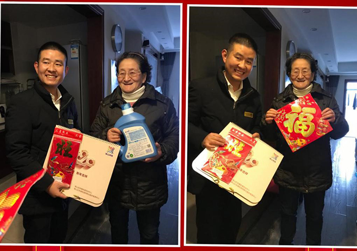 一大早,物業管家、黨員業主代表、社區志愿者便帶著年味十足的對聯、福字貼、大米、食用油等年貨禮品,上門探望了小區里的獨居老人、低保戶、困難戶以及模范家庭,一句“新年快樂”,一陣笑語歡聲,一個暖意十足的握手,彰顯的不僅是來自紅豆物業最真摯的節日問候,更見證了紅豆物業貼心服務的赤誠。