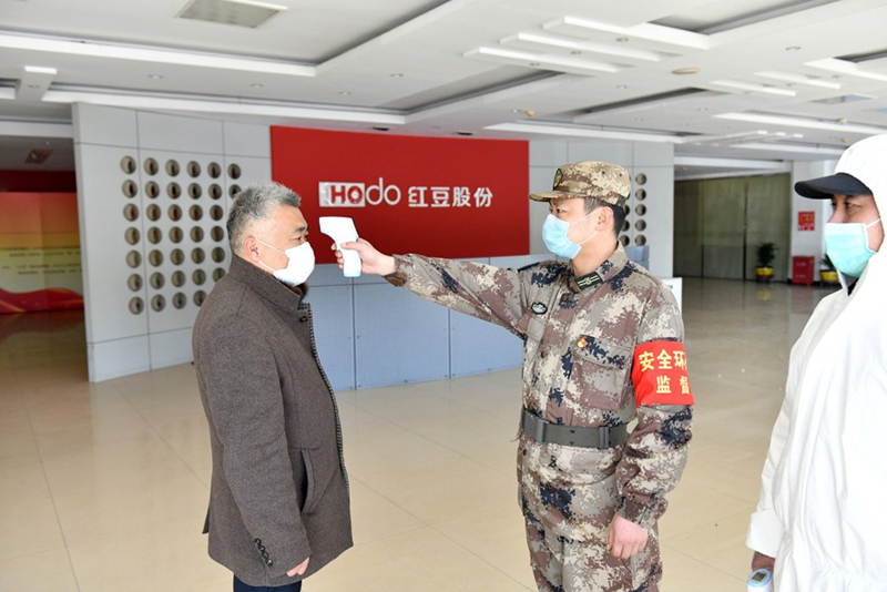 謝軍,是這次紅豆防護(hù)服生產(chǎn)大樓的安全生產(chǎn)負(fù)責(zé)人,也是一名退役軍人,他每天都要對進(jìn)入大樓的員工進(jìn)行排查,檢測好生產(chǎn)工人的體溫。每天早晨7點(diǎn),他已站在大樓門口,面對陸陸續(xù)續(xù)來上班的員工,謝軍和同事一起為每位準(zhǔn)備進(jìn)入的員工進(jìn)行體溫測量。從大年初二至今,謝軍便以廠為家,連續(xù)多日開展疫情防控工作,未曾回過家。近幾日,低于零下的冬季清晨,伴著刺骨的寒風(fēng),讓人忍不住打冷顫。
