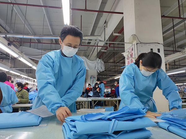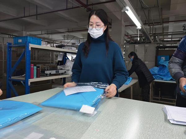 當(dāng)天晚上,紅豆國(guó)際黨委書(shū)記戴敏君立即號(hào)召黨員干部赴生產(chǎn)“前線”支援,于是3月1日早上7點(diǎn),在一線生產(chǎn)車(chē)間,出現(xiàn)了紅豆500多名黨員干部包裝“戰(zhàn)衣”,帶領(lǐng)始終在一線堅(jiān)守的廣大員工一起加油干的火熱場(chǎng)面。