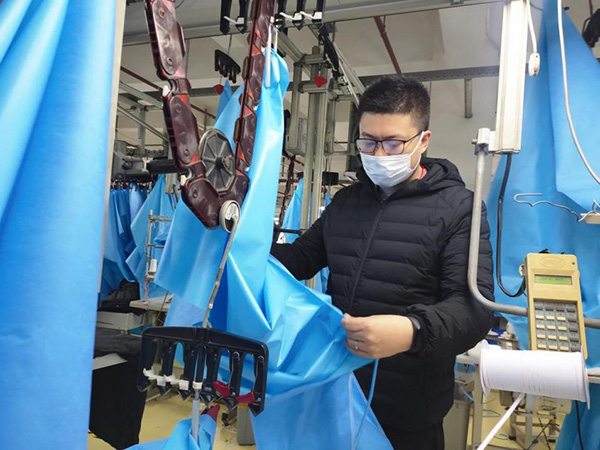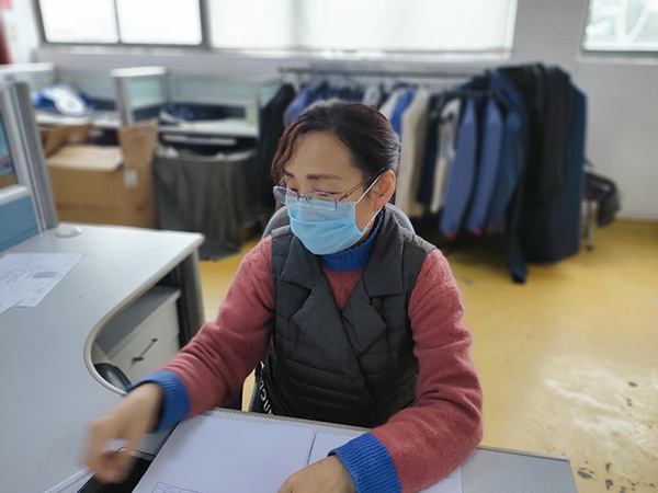 生產(chǎn)任務(wù)更艱巨,面料顏色要求比較特殊,而目前防護(hù)材料又是全球緊缺物資,因此,解決3月1日上午出運(yùn)的3.8萬(wàn)件面料問(wèn)題,最為關(guān)鍵。老黨員顧彩紅再次自動(dòng)請(qǐng)纓,挑下采購(gòu)面料的重?fù)?dān)。