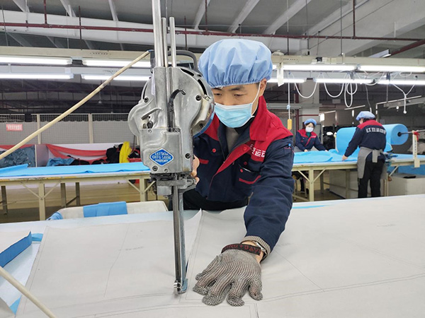 “沒(méi)有現(xiàn)成的提拉工具,就想其他辦法。先用鏟車(chē)把面料運(yùn)到指定區(qū)域,為提高效率,我們用2個(gè)板凳自制了工具,順利將面料快速送上裁剪臺(tái)。”錢(qián)學(xué)民笑著說(shuō)。