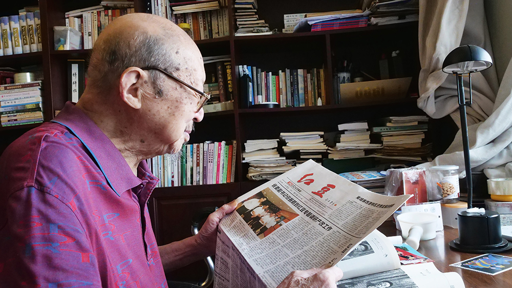 7月29日,今年的七夕前夕,當代著名老詩人、作家、文藝評論家丁芒在家中認真錄制著對紅豆七夕節(jié)20周年的祝福視頻。中國當代詩壇曾有“北臧南丁”之說。丁芒,這位從南通城走出來的大詩人,從抗日戰(zhàn)爭的烽火開始生命的吟唱,80載筆墨為伴,書寫了萬余首激蕩人心的詩篇。面對記者的拜訪,丁芒和其夫人都十分熱情?,F(xiàn)已96歲高齡的他,看起來依舊面色紅潤,精神飽滿。在丁芒老先生家中,能夠感受到濃濃的文化氣息,書柜上、書桌上擺滿了各種書籍。雖然已是耄耋之年,丁芒老先生依然每天以書籍為精神食糧,在他的身上,我們看到了一個詩人對詩詞的忠貞和熱愛,對傳統(tǒng)文化的敬畏和崇拜。